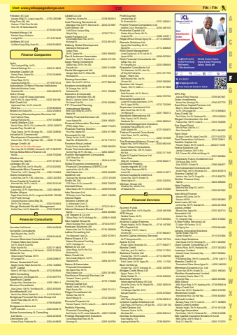 Visit: www.yellowpageskenya.com 133 FIN / FINABCDEFGHIJKLMNOPQRSTUVWXYZFiltration (K) Ltd Aquatec (Bldg 21), Lunga Lunga Rd.......0733 250388King Finn (K) Ltd Godown 17 Athi River Rd, Athi River Rd, Off Addis Ababa Rd .................................................... 0735 601458Pantech Kenya Ltd Pantech Kenya Godowns, Lusingeti Rd .................................... 0715 674636Unifilters (K) Ltd Unifilters Kenya Bldg, Busia Rd............ 0206 532850Finance CompaniesActis The Courtyard Bldg, 1st Flr, General Mathenge Drv....................... 0202 219952Aequitas Capital Ltd Senteu Plaza, Galana Rd ................... 0742 234999Alios Finance Timau Plaza, 7th Flr, Argwings Kodhek Rd ......................... 0719 672124Association Of Micro Finance Institutions Methodist Ministries Centre, Oloitoktok Rd ................................... 0203 862373AVLC Group Block B, Lower Hill Duplex Apartments, 2nd Flr, Rm 24, Upper Hill Rd...............0202 304180Bidii Credit Ltd Applewood Park, 3rd Flr, Suite 301, Wood Ave ....................................... 0709 840000Brijesh Art Dubois Rd...................... 0202 250903Centenary Microenterprise Services Ltd One Padmore Place, George Padmore Rd.......................... 0797 333888Family Welfare Club Nacico Plaza, 5th Flr, 514, Landhies Rd...0202 240679Impala Pay Credit Ltd Twiga Towers, 2nd Flr, Murang%u2019a Rd.......0202 248640Industrial & Commercial Development Corporation (ICDC) Uchumi Hse, 17th Flr, Aga Khan Wlk.......0202 771000Jijenge Credit LtdSee Advert on this class title pages Town Hse, 6th Flr, 604/605, Kaunda St.. 0711 282727Kenya Akiba Micro-Finance Ltd Nairobi ........................................... 0206 750288Kifedha Ltd Chambai Hse, Taifa Rd ...................... 0791 573231Letshego (K) Ltd Cape Office Park, 2nd Flr, Ring Rd........0720 522565Nationwide Micro Finance Ltd Trishul Tws, 1st Flr, Murang%u2019a Rd...........0203 744584Osiris Investments Luthuli Hse, 2nd Flr, 13B, Luthuli Ave......0202 243353Prime Capital & Credit Ltd Kenindia Hse, 4th Flr, Loita St.............. 0202 223139Rentworks (K) Ltd Liason Hse, Gr Flr, State House Ave.......0202 588381Shelter Afrique Eagle Africa Centre, 5th Flr, Longonot Rd.0202 722305The Profin Group Crescent Business Centre (Bldg 28), 5th Flr, The Crescent ......................... 0202 043463Waugh Mcdonald Wealth Management Fedha Plaza, 3rd Flr, Mpaka Rd ........... 0759 704523Financial ConsultantsAccotax Ltd Nairobi........................ 0204 440348Acropolis Consultants New Waumini Hse, 2nd Flr, Chiromo Rd ..................................... 0208 043436Acumen Business Consultants Ltd Professor Nelson Awori Centre, 3rd Flr, Wing B, Suite B6, Ralph Bunche Rd.............................. 0202 715805AfriBiz Consultancy Ltd Nairobi.... 0203 570024Africa Air Inc Wilson Airport Premises, 9th Flr, off Langata Rd ................................. 0206 006837African Guarantee Fund Mayfair Center, Ralph Bunche Rd..........0732 148000AGIP Capital Block B, SK Flats, 5, Rhapta Rd........... 0722 625946AMG Consulting Baraka Court, Ole Sangale Rd............. 0723 497791BaseRock Capital Cargen Hse, Harambee Ave................ 0202 196411Bicomm Consultants Afya Centre, 12th Flr, Tom Mboya St......0202 405449BondMaster(K) Ltd Narshi Hse, Moktar Daddah St............. 0110 044341Bridgecap Financial Services Group Ltd Devan Plaza (Bldg 02), 4th Flr, Crossway........................................ 0798 568296Bridgeworks Africa Ltd ICIPE Duduville ................................ 0203 004215Bukas Accountancy & Consulting Ltd Nairobi..................................... 0202 223529Centomony Ltd Victoria Plaza, Parklands Rd ............... 0204 443695Citidell Co Ltd Citidell Hse, Kivema Rd...................... 0728 652015Cost Planning Services Ltd Maendeleo Hse, 2nd Flr, Monrovia St.....0202 221687Craft Silicon Ltd Craft Silicon Campus Bldg, Waiyaki Way.....................................0755 777111Credit Partners Ltd Consolidated Bank Hse, 3rd Flr, Koinange St..................................... 0722 651475Dalberg Global Development Advisors Kenya Ltd Galana Plaza, 5th Flr, Galana Rd............................. 0202 590002Dan & Anderson Associates Bruce Hse, 11th Flr, Standard St...........0203 315156Danjo Rising Investment Gilfillan Hse, 3rd Flr, Rm 303, Kenyatta Ave ................................... 0202 214396Davita Management Ltd Nextgen Mall, 2nd Flr, Office 20B, Mombasa Rd ................................... 0703 123164Estrang Associates Eaton Tws, 2nd Flr, UN Cre................. 0777 865185Excelpro consulting ltd St. Georges Hse, 4th Flr, Parliament Rd .................................. 0721 793599Executive & Corporate Advisory Services (K) Ltd Block D, Jasmine Centre, Suite 1, Pio Gama Pinto Rd ........................... 0733 220833F P I Financial Planning International Mondial Brick Court (Bldg 05), 2nd Flr, Mpaka Rd ....................................... 0204 441518Fidelity Financial Services Ltd Lower Kabete Rd.............................. 0204 183021Financial Information Services (FIS) Adalyn Flats........................... 0202 715475Financial Training Solution Purvi Hse, Mpaka Rd......................... 0202 471999Finconsult Co Ltd Design Centre, 3rd Flr, Suite 2A, Tausi Rd, off Muthithi Rd..................... 0712 712712Finserve Africa Limited Equity Centre, Hospital Rd .................. 0766 000200Focas Tree International Ltd Summit Hse, 4th Flr, Moi Ave............... 0202 346271Franklin Management Consultants Ltd Viking Hse, 1st Flr, Waiyaki Way ............................... 0204 441123Global Economic Investments & Financial Consultancy (GEIFIC) Ltd Laptrust Hse, 4th Flr, 409, Haile Selassie Ave ............................ 0203 343250Goldfinch Ltd Gemuwa Hse, Mumias South Rd............0727 474351Grofin (K) Ltd CVS Plaza, Gr Flr, Lenana Rd ............. 0202 730279HanVard Africa Delta Towers, 6th Flr, Chiromo Rd..........0203 601628Inka Services Ltd 30 Ro