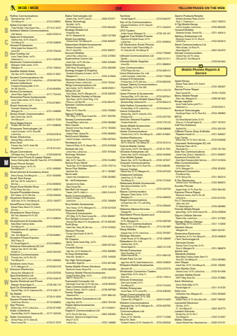 MOB / MOB 206 YELLOW PAGES ON THE WEBABCDEFGHIJKLMNOPQRSTUVWXYZRyfims Communications Nyambene Hse, Gr Flr, Tom Mboya St.................................. 0724 426581Safari Connect Ltd Thika Rd Mall, Thika Super Hwy........... 0715 214375Safetech Mobile Communications Ltd Nairobi..................................... 0202 252319Sajecom Enterprises Interfina Hse, Gr Flr, Shop G1, Tom Mboya St.................................. 0725 349836Sansart Enterprises White Angle Hse, Mezza 9 Flr, Accra Rd......................................... 0720 753449Sara Trading Ltd Accra Trade Centre, 1st Flr, Gaberone Ln.................................... 0731 256789Sarahcom Communications Mfangano Trade Centre, Gr Flr, Mfangano St.................................... 0722 169242Satellite Mobile Sales City Hse, Gr Flr, Standard St ............... 0203 315261Scratch Communications Ltd Luthuli Complex, Gr Flr, Luthuli Ave........0729 887300Sereria Collections Foresters Shopping Mall, Gr Flr, Rm 9B, Moi Ave................................ 0740 864584Sevtra Connections Jamia Plaza, Kigali Rd ....................... 0717 752163Shannima Phone Accessoories Accra Trade Centre, Gr Flr, Shop 14, Accra Rd......................................... 0724 679991Shark Ventures Ltd Sunbeam Shopping Complex, Mfangano St.................................... 0721 496696Sharp Oriesh Communication Meru South Hse, 3rd Flr, Tom Mboya St.................................. 0202 217228Shop Nagar Kenya Royalty Hse, Moi Ave......................... 0711 699658Showcase Technologies Ltd Luthuli Complex, 1st Flr, Shop B8, Luthuli Ave ...................................... 0729 637818Siman Electronics Skymall Bldg, Luthuli Ave.................... 0722 331917Simu Deal Pioneer Hse, 3rd Flr, Suite 304, Kenyatta Ave ................................... 0718 911431Skype Connections Old Nation Hse, Tom Mboya St ............ 0729 808106Smart Care Phone & Laptop Repair Koone Clothing Mall, Shop B8, Tsavo Rd..0710 996650Smart Phone Screen Dominion House, 1st Flr, D1, Tom Mboya St.................................. 0721 499285Smart phones & Accessory Arena Ebony House, Tom Mboya St............... 0721 909386Smart Tech Kenya Bihi Tws, 5th Flr, Suite No.11, Moi Ave .......................................... 0722 885600Smart Zone Mobile Shop KTDA Plaza, Moi Ave......................... 0721 390915Smarta Phonetabs kenya Bihi Towers, Gr Flr, Moi Ave................. 0728 283209Smartcom Electronics NCM Hse, Gr Flr, Tom Mboya St............0722 169277SmartPhone Care Center Bazaar Plaza, Mezz 4 Flr, Suite 6, Moi Ave .......................................... 0724 874754Smartphone Store Kenya Bihi Tws, Basement Flr Flr, B4, Moi Ave .......................................... 0714 398534Smartphones & Accessories Beba Beba Trading Center, Tom Mboya St.................................. 0705 955559Smartphones & Laptops Philadelphia Hse, Tom Mboya St........................... 0726 826661Snowline Phone Express RNG Plaza, Gr Flr, Ronald Ngala St .......................... 0743 088800Sokopoa International (K) Ltd Veteran Hse, 5th Flr, Rm 508, Kimathi Ln....................................... 0202 260185Solotech Communication Princely Hse, 1st Flr, Rm G2, Tom Mboya St.................................. 0721 486364Solutions Amber House, Gr Flr, Mfangano St........................... 0720 661078Sotocom Electronics Mecca Hse, Mfangano St.................... 0724 597030Spai Distributors Ltd Reata Hse, 2nd Flr, Accra Rd............... 0720 434419Sparks Electrical and Phone Repair Ronald Ngala St................... 0726 881179Spot On Entertainment Skymall Bldg, 1st Flr, Gaberone Rd........0715 035177Sq Mobile Kalsi Hse, Luthuli Ave........................ 0720 014300Square Phones Kenya Imenti Hse, Moi Ave........................... 0716 384892Star Phones Ribeiro Hse, Gr Flr, Luthuli Ave ............ 0722 971999Static Collections Skymall Bldg, 2nd Flr, Gaberone Rd.......0717 223333Static Connections Winnie Plaza, Gr Flr, Store A2, Race Course Rd............................... 0720 517575Statra Technologies Ltd Uniafric Hse, 3rd Flr, Loita St............... 0208 072371Steiss Technology Sky Mall, 1st Flr, 4th Parklands Ave ............................. 0703 664455Strategic Mobile Ltd Prosperity Hse, 5th Flr, Westlands Rd......................... 0203 747358Street Connection Victoria Court, Tom Mboya St .............. 0726 849357Subscribers Mobile Accessories Midtown Business Plaza, Gr Flr, Rm 21, Accra Rd .............................. 0722 909271Suncom Mobiles Luthuli Hse, Luthuli Ave...................... 0722 215902Superiorfone Comm Ltd Imenti Hse, 1st Flr, Moi Ave................. 0202 223840Swish Electronics RNG Plaza, Ronald Ngala St............... 0724 065298Synergy Images & Graphics Sunbeam Shopping Complex, 3rd Flr, Mfangano St.................................... 0720 415944Tabasamu Mobile & Accessories Electronic House, Luthuli Ave .............. 0722 722441Tafrija Communications Ltd Apic Centre, 1st Flr, Muthithi Rd ........... 0208 000511Tafrija (K) Ltd Terry House, 2nd Flr, Mfangano St.........0722 602567Taifa Tekelezi Society of Kenya Ojijo Plaza, 3rd Flr, North Wing, C10, Plums Ln, off Ojijo Rd ........................ 0734 664701Talentoh Communication Free Market Place, Gr Flr, River Rd ....................... 0720 755650Taproot Traders OTC Bldg, Gr Flr, Race Course Rd........0727 326758Tarwaq Communication Skymall Bldg, Luthuli Ave.................... 0729 360666Tech Centre Norwich Union Hse, Kimathi St ............ 0712 193300Tech Garage Galana Plaza, Galana Rd ................... 0700 069830TechCrunch Mobiles Luthuli Complex, Luthuli Ave................ 0780 097543Techdepot_ke Diamond Plaza, Gr Flr, Masari Rd..........0723 919048Techken Ke Ltd Luthuli Hse, Luthuli Ave...................... 0707 879446Techmap Solution Koone Clothing Mall, Gr Flr, Tsavo Rd ........................ 0735 314900Techno Evan World Travel Hse, Gr Flr, Mama Ngina St.........0723 732714Tecno