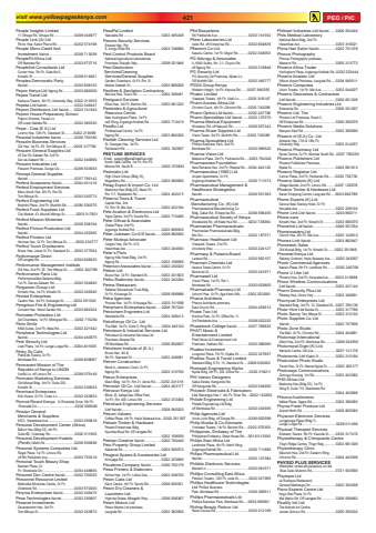 visit www.yellowpageskenya.com 421Philmart Industries Ltd Nairobi ..... 0206 554344Phils Medical Laboratory National Bank Bldg, 2nd Flr, Harambee Ave ................................. 0203 316021Phina Hair Salon Nairobi............... 0202 731378Phocus Photography Phocus Photography premises, Mawensi Rd..................................... 0205 213772Phoenix Africa Trader Hurlingham Plaza, Argwings Kodhek Rd..0202 223444Phoenix Aviation Ltd Wilson Airport Premises, Lang%u2019ata Rd.....0204 945511Phoenix Computers Union Towers, 1st Flr, Moi Ave ............. 0202 044027Phoenix Decorators & Contractors Ltd Nairobi..................................... 0206 651026Phoenix Engineering Industries Ltd Enterprise Rd................................... 0206 531097Phoenix Ltd, The Phoenix Ltd Premises, Road C, Off Enterprise Rd .............................. 0206 550076Phoenix Media Solutions Manyani East Rd .............................. 0202 309090Phoenix of (E.A) Co. Ltd Ambank Hse, 17th & 18th Flr, University Way ................................. 0202 014257Phoenix Pharmacy Ltd Epren Centre, Gr Flr, Mumias South Rd...0207 782259Phoenix Publishers Ltd Phoenix Publishers Premises, Kijabe St......................................... 0202 691810Phoenix Registrar Ltd Corner Plaza, 3rd Flr, Parklands Rd.......0203 752730Phoenix Safaris (K) Ltd Village Market, 2nd Flr, Limuru Rd.........0207 122878Phoenix Timber & Hardware Ltd Karen Shopping Centre, Lang%u2019ata Rd.....0203 882789Phone Experts (K) Ltd Sarova New Stanley Hotel, Gr Flr, Kenyatta Ave ................................... 0202 228104Phone Link Ltd Nairobi .................. 0203 860711Phone-care Kimathi Hse, 2nd Flr, Kimathi St ........... 0202 060070Phonelink Ltd Nairobi .................... 0206 557254Phonemasters Ltd Church Hse, 6th Flr, Moi Ave ............... 0202 142810Phones Link Nairobi....................... 0203 862647Phonetech Sales Old Mutual Bldg, 1st Flr, Kimathi St.......0202 251949Phonetel Kenya Ltd Railway Godown, Haile Selassie Ave......0202 243007Phonk Commercial Agencies Nacico Plaza, 5th Flr, Landhies Rd.........0202 240709Phonz U Like Ltd Phoenix Hse, 2nd Flr, Kenyatta Ave.......0203 310888Phonz Wireless Communications Ltd Nairobi..................................... 0202 247144Phorm Security Plus Ltd Plessey Hse, Uhuru Hwy .................... 0202 346691Phornycat Enterprises Ltd Standard Bldg, 3rd Flr, 12, Standard St...0207 785130Photo Hive Ltd Banda St................ 0203 317766Photo Savoy Tom Mboya St ............ 0203 313133Photo Supplies Co Ltd Nairobi........................................... 0202 727909Photo Zone Studio The Mall, Gr Flr, Chiromo Rd ............... 0204 444891Photomap International Allbid Hse, 2nd Flr, Mombasa Rd...........0208 024550Photomural Gigiri (K) Ltd Warwick Centre, UN Ave .................... 0207 121176Phototronic Ltd Kijabe St ............... 0202 215194Photovision Photo Studio Travel Hse, Gr Flr, Mama Ngina St.........0202 300177Photoways Communications Gichugu Housing, Voi Rd.................... 0202 243382PHS Africa Ltd Madonna Hse (Bldg 03), 1st Flr, Wing B, Suite 119, Westlands Rd .................................................... 0204 452666Phtuma Auctioneers Nellea Plaza, Ngara Rd...................... 0202 390083Phyma Fresh Produce Ltd Airport North Rd ............................... 0206 825083Physcom Electronic Services Lungalunga Plaza (Bldg 7), Lunga Lunga Rd............................... 0208 011456Physical Therapist Services Ecobank Towers, 9th Flr, Kaunda St.......0203 317472Physiotherapy & Chiropractic Centre Thigiri Ridge Centre, Thigiri Rdg........... 0202 661309Physiotherapy Clinic Waumini Hse, 2nd Flr, Eastern Wing, Chiromo Rd ..................................... 0204 443306PHYSIO PLUS SERVICESWebsite: www.physioplus.co.ke Blue Gate, Mutomo Rd...................... 0721 933590Physique Ltd Le Rustique Restaurant, General Mathenge Drv....................... 0202 324408Piano Experts Centre Ltd Kogo Star Plaza, Gr Flr, Mai Mahiu Rd, Off Langata Rd............. 0206 008482Picalilly Intl Ltd The Nairobi Art Centre, James Gichuru Rd ............................ 0205 255232Pfid Biosystems 5th Parklands Ave ............................. 0203 741552Pfizer Laboratories Ltd Isiolo Rd, off Enterprise Rd.................. 0202 654835Pflament Co Ltd Kasuku Centre, 1st Flr, Migori Rd..........0202 340053PG Ndungu & Associates A, KMA Suites, No. 3.1, Chyulu Rd, off Ngong Rd ................................... 0205 216846PG Security Ltd PG Security Ltd Premises, Mpesi Ln, Off Muthithi Rd ................................. 0202 340777PGDA Group Kenya Western Height, 1st Flr, Karuna Rd.......0207 840255Phalon Limited Viewpark Towers, 4th Flr, Utalii Ln.........0203 318147Pharm Access Africa Ltd Chiromo Court, 4th Flr, Chiromo Rd.......0203 743296Pharm Optics Ltd Nairobi...............0202 247796Pharm Specialities Ltd Nairobi ..... 0202 107075Pharma Medical Equipment Wundanyi Rd, off Nanyuki Rd .............. 0206 557342Pharma Share Supplies Ltd Vision Tower, 3rd Flr, Muthithi Rd..........0203 745289Pharma Specialities Ltd Phillips Business Park, 2nd Flr, Mombasa Rd ................................... 0203 569520Pharma Vision Ltd Maksons Plaza, 3rd Flr, Parklands Rd.....0203 754342Pharmaccess Foundation New Rehema Hse, 3rd Flr, Rhapta Rd....0204 442120Pharmaceutica (1985) Ltd Unipen Apartments, Gr Flr, Argwings Kodhek Rd ......................... 0202 711573Pharmaceutical Management & Healthcare Strategistics Nairobi ........................................... 0206 551363PharmaceuticalManufacturing Co. (K) Ltd Pharmaceutical Manufacturing Co. Bldg, Dakar Rd, /Enterprise Rd ............ 0206 556455Pharmaceutical Society of Kenya Woodlands Rd, off State Hse Rd...........0202 738364Pharmaclan Pharmaceuticals Pharmaclan Pharmaceuticals Bldg, Moi Drv........................................... 0202 187571Pharmaco Healthcare Ltd Viewpark Towers, 21st Flr, University Way ...............